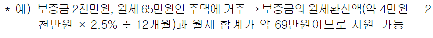 보증금이 5천만원을 초과한다면 월세 지원을 받을 수 없지만 월세가 60만원을 초과하는 경우에 월세와 보증금의 월세환산액을 합한 금액이 70만원 이하 일 경우 지원 가능합니다.