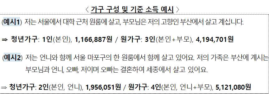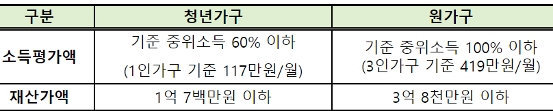 청년가구의 경우 기준중위소득이 60% 이하여야 하며 원가구는 기준중위소득 100%이하여야 합니다.