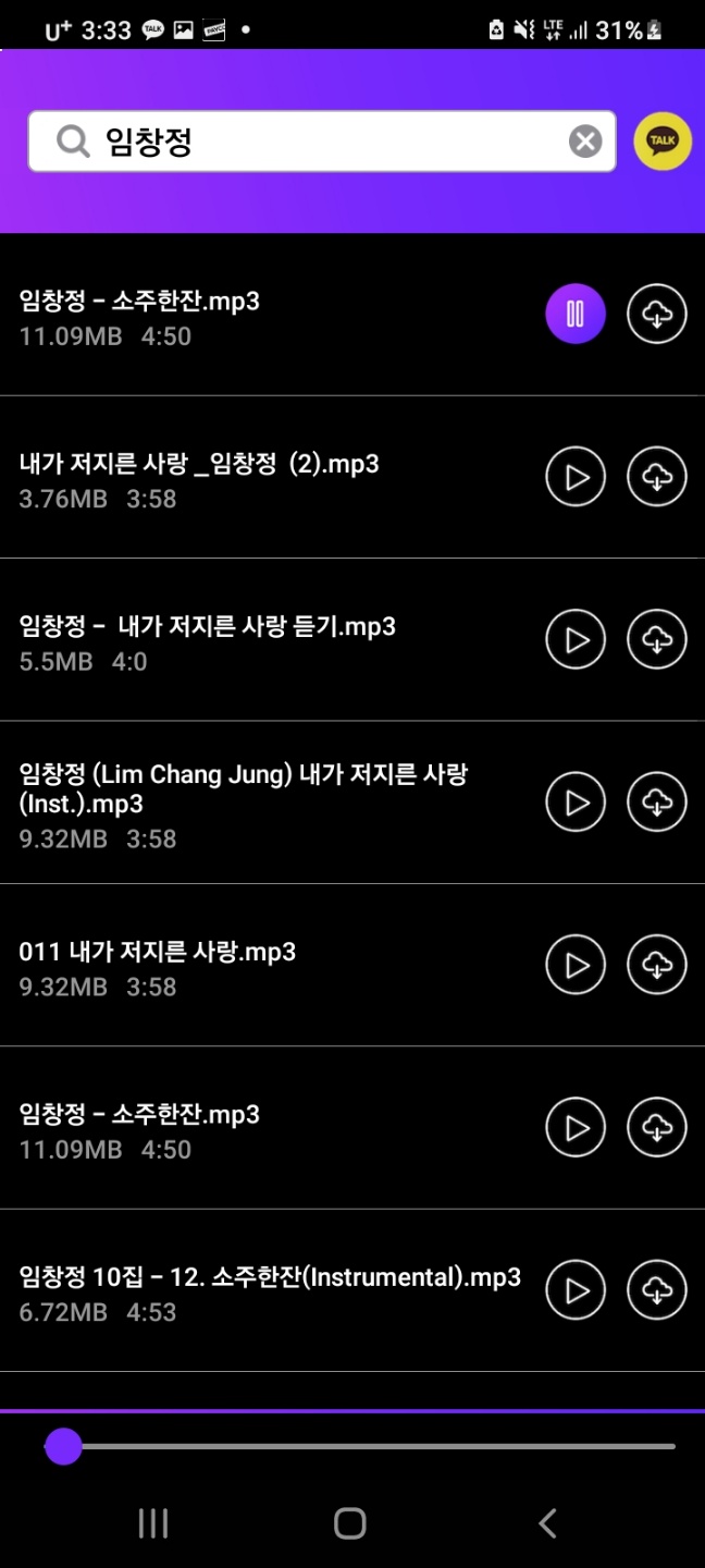 원하는 노래를 검색하시면 노래가 나옵니다. 화살표 모양은 바로 재생하는 모양이고, 저희가 원하는 건 데이터를 덜 사용하기 위해 다운로드하는 것이니 구름을 클릭하여 다운로드 후 내 파일로 들어가시면 노래가 다운로드하여져 있으니 들으시면 됩니다. 간단하죠?