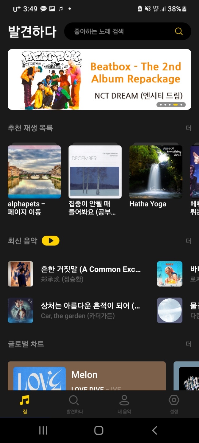 다운로드하으셨으면 끝났습니다. 웬만한 돈 내고 듣는 어플과 똑같이 생겼습니다. 바로 검색창에 원하시는 노래 검색하셔서 듣기만 하시면 됩니다.