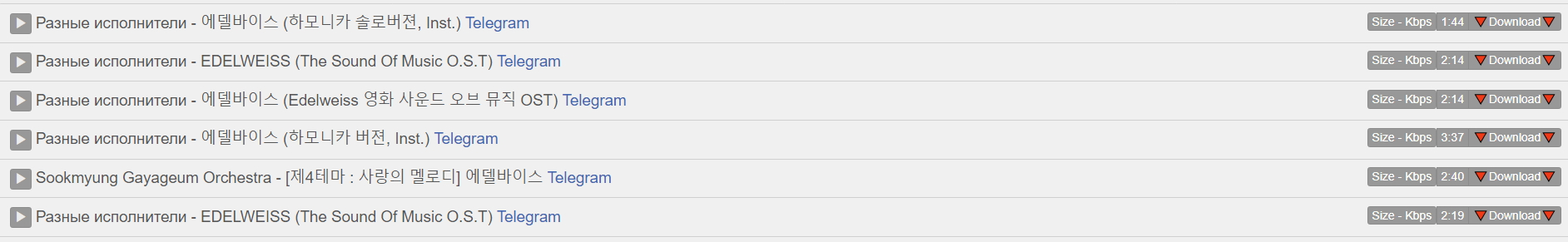 에델바이스는 ost로 많이 들어가는 음원이라 여러 음원이 많죠? 맨 오른쪽 다운로드 버튼을 클릭합니다!