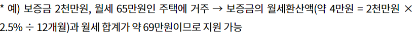 만일 보증금이 5천만원을 초과하면 월세 지원을 받을 수 없지만 월세가 60만원을 초과하는 경우에는 월세와 보증금의 월세환산액을 더한 금액이 70만원 이하일 경우에는 혜택을 받을 수 있습니다.