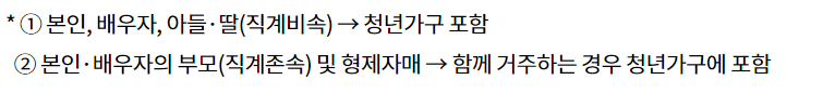 청년가구는 청년 본인과 배우자, 자녀를 말하며, 본인과 배우자의 부모 , 형제자매 등 다른 가족이 청년과 함께 거주하는 경우에도 해당 가족은 청년가구에 포함됩니다.