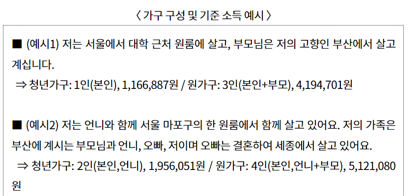 청년가구 뿐 아니라 청년과 부모를 포함한 원가구 소득 및 재산이 아래 기준을 충족해야 월세지원을 받을 수 있습니다.