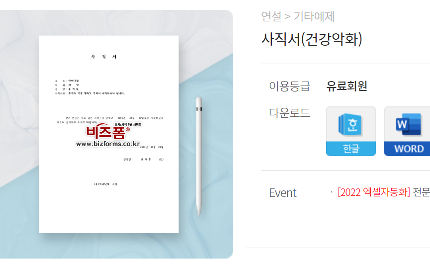 사직서(건강악화) 샘플 및 사직서(건강악화) 양식 다운로드 (bizforms.co.kr)